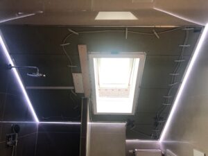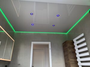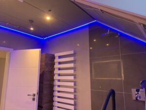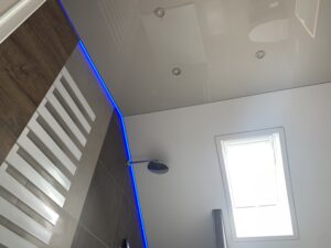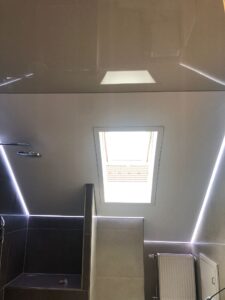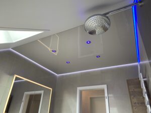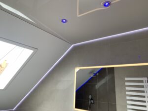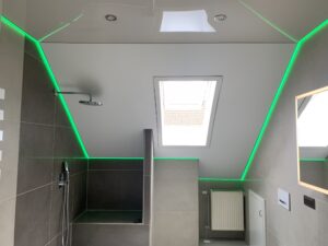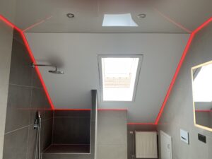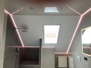 In diesem Projekt wurde ein Badezimmer mit Dachschräge vollständig neu gedacht. Zum Einsatz kam eine Kombination aus matter und hochglänzender Lackspanndecke, ergänzt durch ein umlaufendes RGB-Lichtsystem.